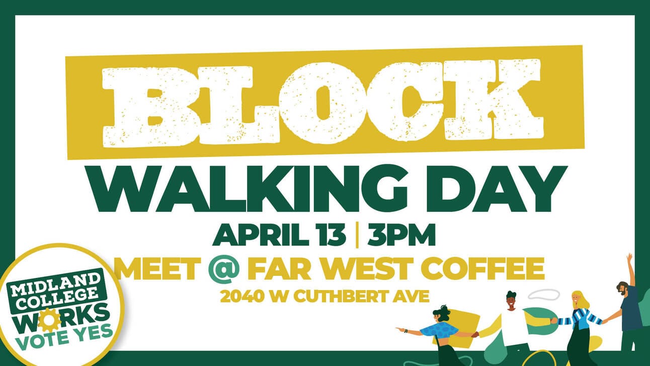 Join the community for Block Walking Day as we rally support for the upcoming Midland College bond. We’ll meet at Far West Coffee to grab walking lists and then head out to knock doors and connect with neighbors.